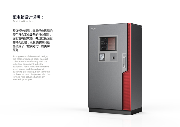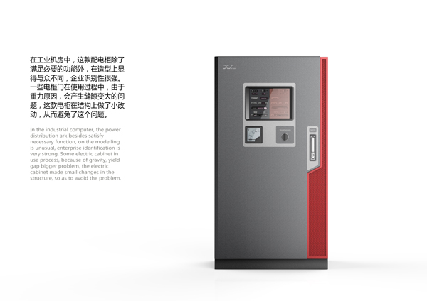 创新性:这款工业配电柜在造型设计上做了较大的突破和改变,目前的工业电柜大多造型呆板笨重,操作面板在人机工程学上考虑欠佳,这款电柜的设计改善了这些问题。